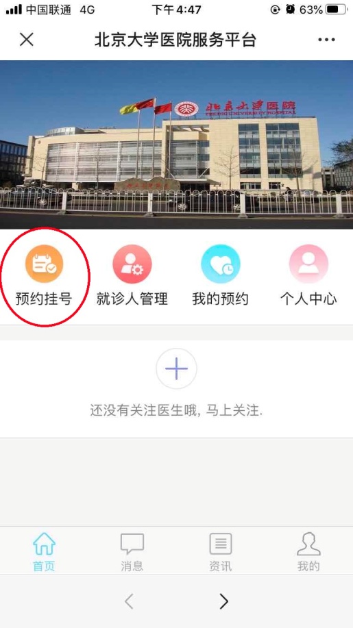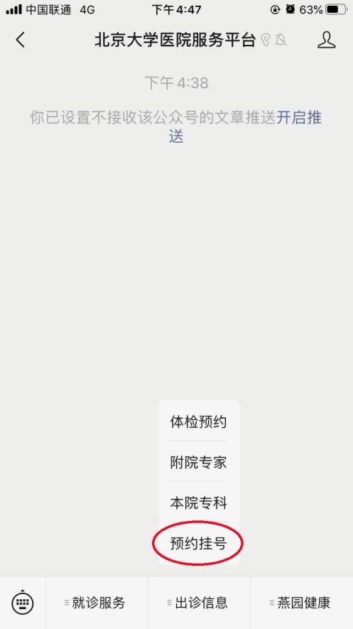 第一步:点开北京大学医院服务平台公众号,在“出诊信息”里选择“预约挂号”。
