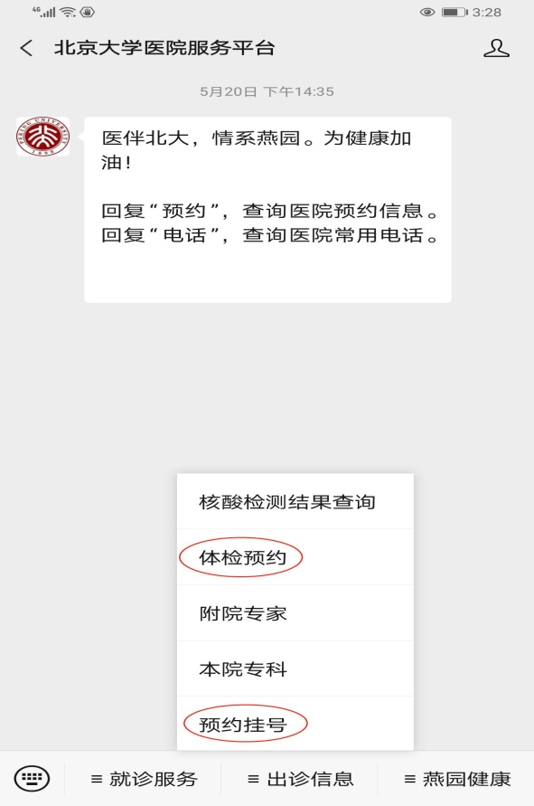 1.常规健康体检预约:请您在微信公众号(北京大学医院服务平台)进行预约:进入微信公众号→出诊信息→体检预约,根据体检类别进行选择,请您按照预约时间段前来体检。